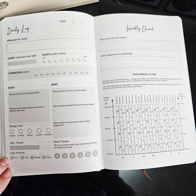 Each journal holds 120 pages, which includes dedicated sections for monitoring sleep, hydration, physcial and mental state, mood and exercise, helping users build self-awareness and maintain healthy habits. At the end of each month, special summary pages allow reflection on achievements, trends, and personal growth, turning daily journaling into a meaningful and motivational practice.